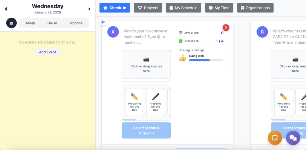 - Kanboombo.com para transparencia y seguimiento con Check ins para estar sincronizados e identificar el estado de cada integrante instantaneamente. Están nos mantiene en un estado de flow y permite el control de avances.